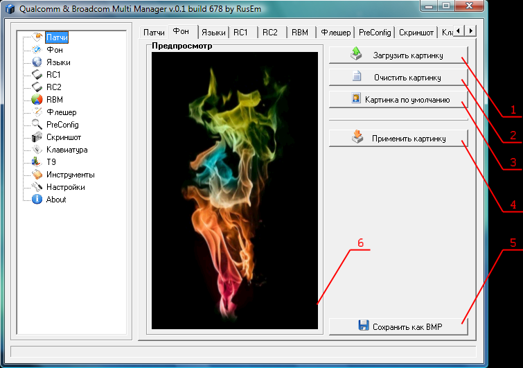 Вкладка предназначена для установки своей картинки на фон Main Menu, а также для конвертирования изображений из .bin в .bmp. 1. Загрузить картинку из файловой системы компьютера. 2. Очистить загруженную картинку или картинку по-умолчанию. 3. Вернуть на фон картинку по-умолчанию. 4. Установить загруженную картинку на фон Main Menu. 5. Сохранить загруженную картинку в формате .bmp. 6. Окно для предпросмотра загруженных изображений. Инструкции.Установка своего изображения на фон Main Menu: 1. Нажимаем кнопку 1 и выбираем картинку, которую хотим сделать фоном. Картинки должны иметь разрешение 240х400 или 240х320 (соответственно выбранной модели телефона). 2. Нажимаем кнопку 4. Конвертирование изображений из .bin в .bmp: 1. Нажимаем кнопку 1 и выбираем нужное изображение в формате .bin. 2. Нажимаем кнопку 5, вводим имя файла и сохраняем его. |